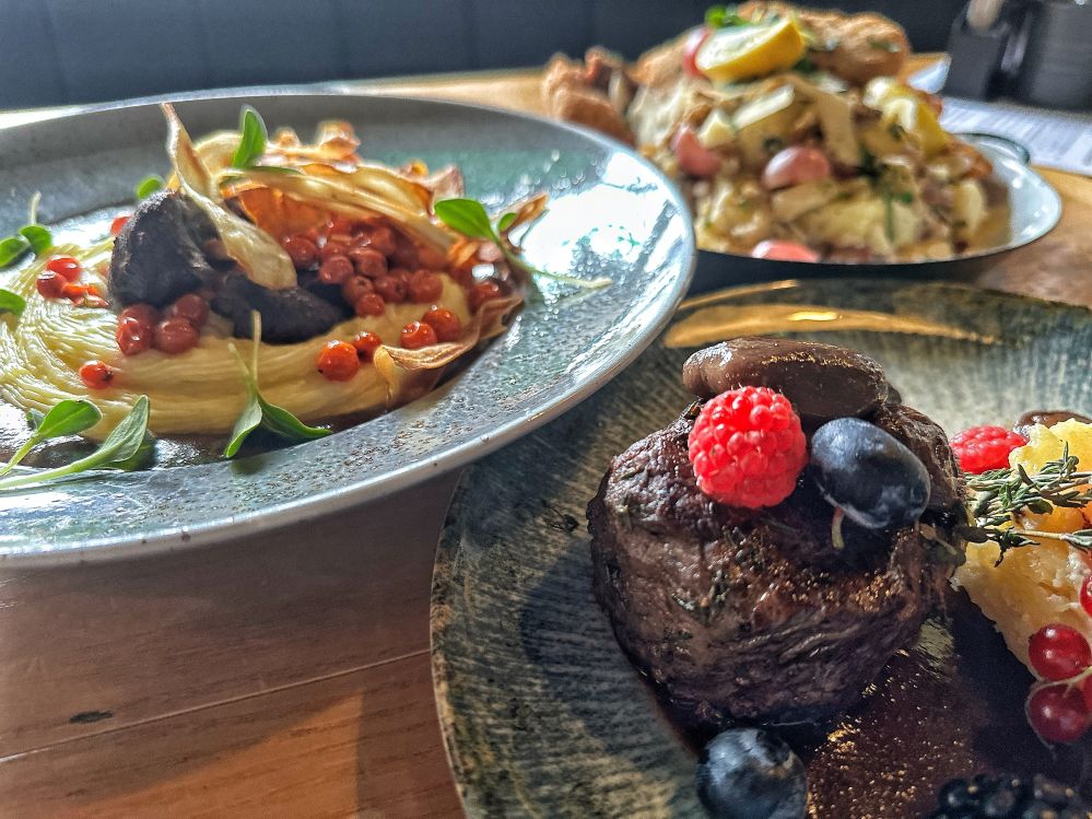 houby shiitake, bramborová fondány, ostružinové demi-glace ( , , )